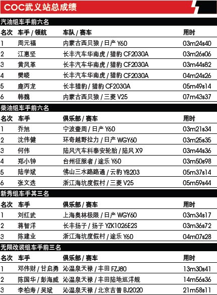 | 在柴油组, 陆风车队这次携手武义本地的科泰安轮胎,组成陆风汽车科泰安轮胎车队,预赛中,陆风车队不太顺利,主力车手李鹏程在双边桥出现失误,赛车损坏没能完赛,何伟以第四身份进入决赛,何懿冬表现不 佳与决赛无缘。宁波壹周俱乐部的乔旭勇猛无比,夺走柴油组冠军,不过乔旭依然不太满意:“第一圈刚发车就白扔了3 秒多,因为根本就没看到发车信号,太可惜了。再加上赛车变速器还有点小问题,好在最终还是拿了冠军,否则真会很郁闷。” 环奇越野拉力车队的沈伟健异军突起,获得亚军,“第一圈在右侧坡时差点翻了,这耽误了我足有四五秒钟,很遗憾。所以第二圈我只有全力去拼了,一些原本该收油的地方也没收。我对自己今天的整体表现还是挺满意的,而且亚军的结果也不错,希望接下来在厦门能有更好的发挥。” 沈伟健表示。陆风汽车科泰安轮胎车队的何伟在第一圈刚过跷跷板,发现后驱没了,坚持完赛并赢得第三,也算不错的成绩。最郁闷的要算佛山三水路路通车队陆学斌:“今天实在太郁闷了,本来能得冠军结果一下子没名次了。以前我没出现过这种事,太意外了。决赛冲刺时没看好路,所以开得有点歪,斜冲出了赛道,把计时器都撞翻了。这种事也只能怪自己,希望以后的比赛能把遗憾补回来。” | ||||