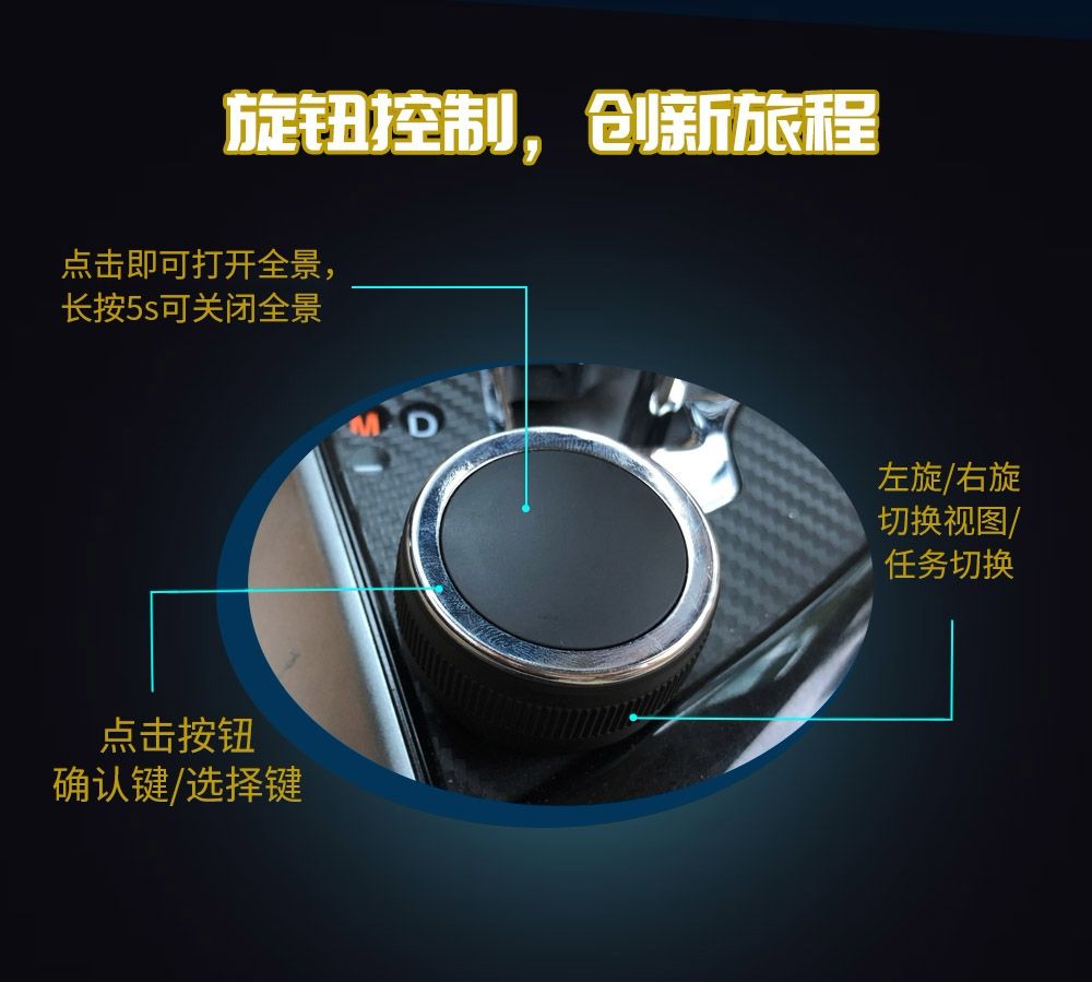 与以往或其他品牌不同,本次进阶版360°全景创新性地采用旋钮操作,支持旋钮切换各种视图,个性化设置爱车。旋钮位置随车主习惯在中控台随心进行安排。此外,增加个性化全景车模,可按车主具体车型自动切换SUV或轿车车模。
