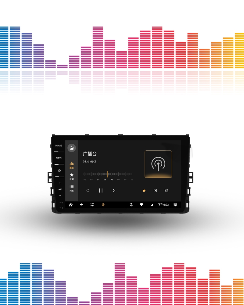 升级原厂款中控小屏,飞歌大众MQB平台-GE系列9英寸高清IPS屏,符合人体工学设计,1024×600分辨率,支持MiraVision色彩调节功能,画显栩栩如生;UI设计高度匹配大众原厂高配风格,内饰浑然天成,秒变高配座驾!